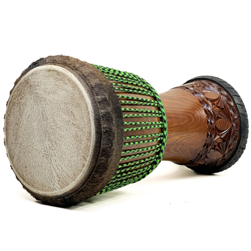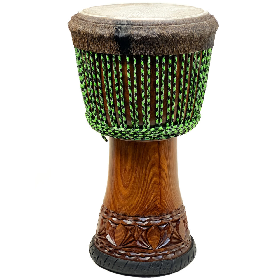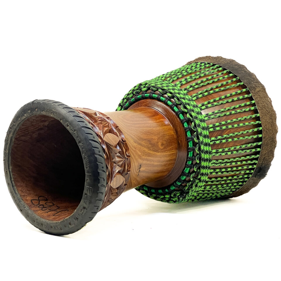 This is a beautiful djembe made by the WULA drum company in Guinea West Africa. This particular djembe is categorized at a “classic” by the folks at WULA! WULA was founded by my first djembe teacher, Michael Markus in 2005 and WULA has done great things not only for improving the quality of djembes, but re-forestation and providing competitive wages for workers in Guinea.