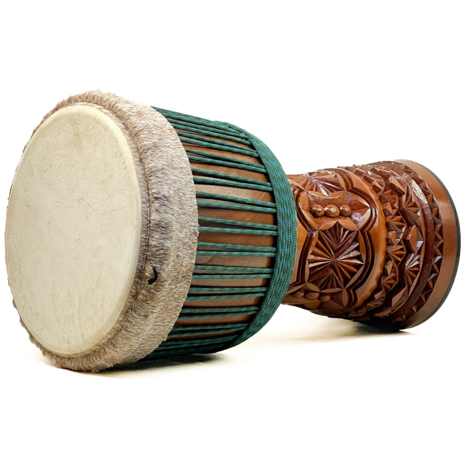This is a beautiful djembe made by the WULA drum company in Guinea West Africa. This particular djembe is categorized at a “special piece” because of how awesome it is! WULA was founded by my first djembe teacher, Michael Markus in 2005 and WULA has done great things not only for improving the quality of djembes, but re-forestation and providing competitive wages for workers in Guinea.